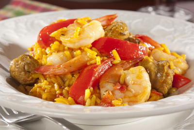 Paella (pronounced pie-ay-yuh) is traditionally made with a variety of meats, shellfish, and veggies, each prepared separately before being combined in one big ol' pot. Our lightened-up version of One-Pot Paella is much easier, since everything cooks together!
